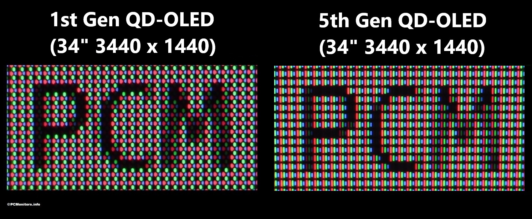 Samsung Display QD-OLED technology combines a blue OLED light source for each individual pixel with layered red and green Quantum Dots. Rather than the red, green and blue subpixels being arranged in an RGB stripe layout, they’re typically arranged in a ‘triad’ design shown below, with the green subpixel located above the red and blue subpixel. The monitor used as an example in this section of the article is the Dell Alienware AW3423DW with a 34.18” 3440 x 1440 screen, yielding a pixel density of 109.11 PPI (Pixels Per Inch). The same subpixel structure is used for all current ~34″ QD-OLED models as they’re based on the same so-called ‘gen 1’ panel.