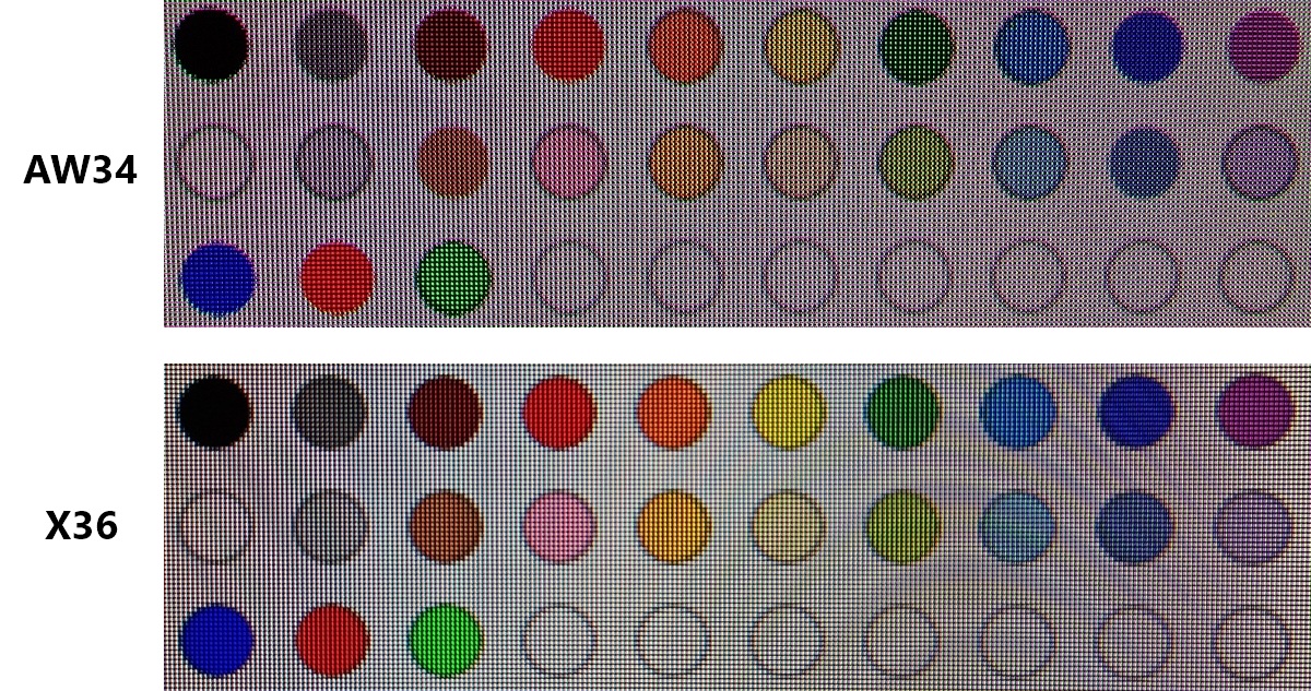 As an Amazon Associate I earn from qualifying purchases made using the below link. Where possible, you’ll be redirected to your nearest store. Further information on supporting our work. LG Display WOLED technology uses a white OLED light source and typically includes 4 distinct subpixels. Three of these filter the light into red, green and blue whilst the forth is an unfiltered white subpixel. This is used to provide the brightness of the monitor and is particularly dominant for high brightness situations, such as when displaying bright HDR content. The first image below shows a macro of the subpixels, but the arrangement is not distinct. The second image shows a vertical stripe with single pixel ‘dots’ of red, white, blue and green to better show the ordering of the subpixels (RWBG). The monitor used as an example in this section of the article is the ASUS PG27AQDM with 26.5” 2560 x 1440 screen, yielding a pixel density of 110.84 PPI. Many WOLED models share this specific RWBG subpixel layout, but some newer generation WOLED models have switched to a RGWB layout which significantly reduces (though does not entirely eliminate) some of the fringing issues covered in this section. We explore this in a section of our ASUS ROG Swift OLED PG32UCDP review, which is a 31.5″ ‘4K’ UHD model using this layout. Following ClearType optimisation, there’s fairly distinct fringing around a lot of text – like a shadowy displacement of the main text. For smaller text it tends to look over-sharpened, as if the sharpness of the monitor is set too high – but adjusting the sharpness control of the monitor, if that’s an option, won’t correct this. For larger text it’s even more noticeable as that has larger straight edges, with the fringe appearing as a shadow to the left of the text. If you disable ClearType then these text rendering issues don’t occur, but text generally has an unusually slender look with inconsistent bolding or spacing of some letters. We’re used to seeing the more consistent and generally ‘cleaner’ appearance with ClearType optimisation enabled and that has been the default state in Windows for many years. The fringing is brighter but less saturated than what we observed on the QD-OLED ultrawide panel and we found it more eye-catching, though that’s subjective. The images below show some text from the website (larger and smaller text) with ClearType enabled and disabled, respectively. This helps highlight the fringing present with the setting on but not off – it’s highly magnified compared to what you’d see to the eye, but as noted we found this quite obvious to the eye as well. Some applications, such as Adobe Reader used to view PDFs, use their own subpixel rendering system optimised for RGB. So disabling ClearType doesn’t affect them and fringing can be observed regardless. Coloured text or objects against very light backgrounds can have particularly noticeable fringing which isn’t influenced by ClearType. Highlighting text in yellow or yellow objects are the worst offenders, but other shades such as orange and chartreuse can also be problematic. Here, there is a defined red edge to the left and bright green to cyan edge to the right. Pure greens and some turquoise shades are interesting as they appear to have a similar bright fringe to the right, but to the left they have a dark (rather than clearly red) fringe. The image below shows a range of highlight colours surrounding black text, making this fringing particularly clear. The black text with yellow background also highlights some colourful fringing, though this is exaggerated in the image and not as noticeable by eye as the fringing described earlier against the light background. You can also see this slight colourful fringing when looking at yellow emoji against dark background (e.g. Twitter ‘Lights out’ mode). The images below show this fringing with a folder icon and shows some text beside it, with the first image showing ClearType on and the second ClearType off. Note the representation and fringing around the text changes, but the folder fringing remains the same. To help highlight differences between how the fringing manifests on WOLED and QD-OLED, we’ve included some images showing the colour swatches of Microsoft paint on both a WOLED screen (top) and QD-OLED screen (bottom). You would observe similar behaviour if you were to draw shapes of the same colour or simply observe objects of the same colour at their edge. For the WOLED screen you can see that some colours show a clear fringing to the left and right, as described earlier with the highlights. Most noticeable for yellow-biased shades but with a dark fringe to the left for some other shades. With the QD-OLED you can see a colourful fringe right around some of the swatches, most noticeably for the black – this is similar to the ‘table of contents’ example given earlier in the article. As noted earlier, this colourful fringing on the QD-OLED is greatly exaggerated in images like this. Really, which fringing is ‘worse’ is situational and quite subjective. Overall, though, we found some of the fringing more noticeable on the WOLED screen than on the QD-OLED. For occasional productivity use or browsing the internet you may not find the fringing problematic (again, subjective). But for significant productivity-focused usage including design work, drawing, image editing, working with coloured text or anything with colourful UI elements against lighter backgrounds you’re likely to observe strong fringing on the WOLED that could be rather bothersome. And you may notice colourful fringing on the QD-OLED that you’d find bothersome. As with the QD-OLED, there’s a possibility you could notice some fringing in games and movie content with very specific shade combinations if you looked out for it when there was little going on. Certain text, HUD elements and icons could show it. But the main content tends to be fa
