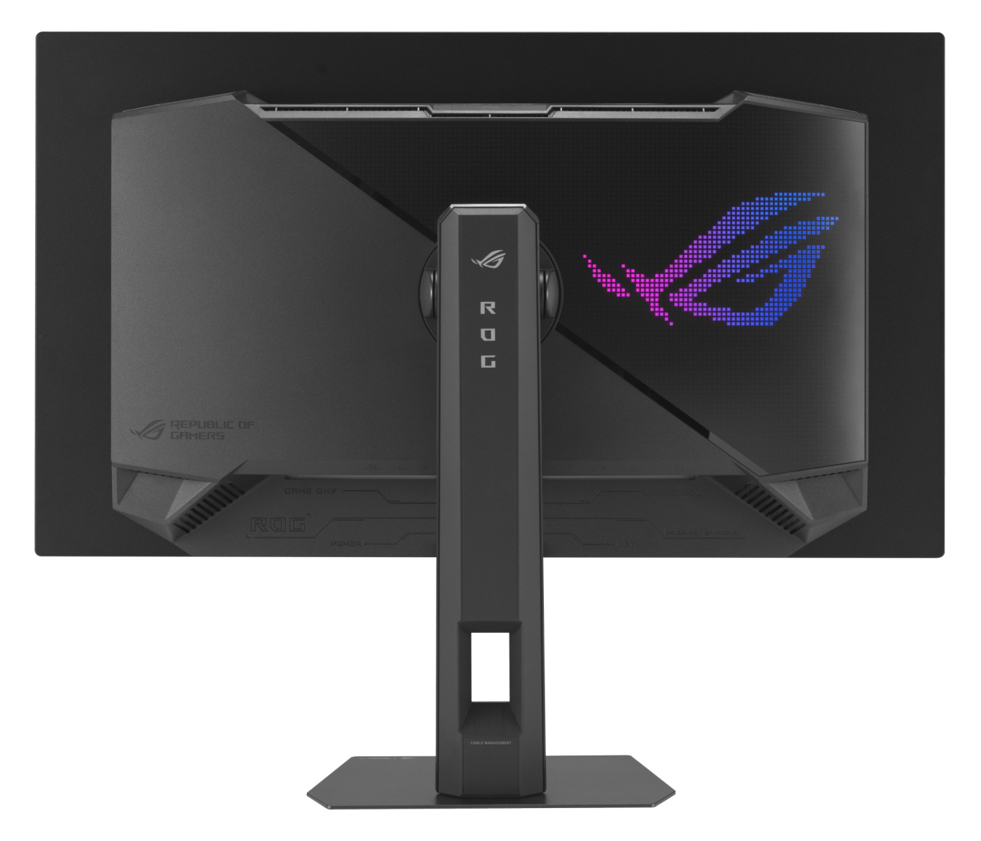 VESA DisplayHDR True Black 500 certification is included – requiring higher brightness levels, including full screen white brightness, than the more common True Black 400 certification. An HDR mode with higher peak brightness is also included. With this the monitor can provide some strong brightness peaks, make good use of its per-pixel dimming and put its generous gamut plus 10-bit colour to good use. A 0.03ms grey to grey response time is specified, with OLED technology known for exceptional pixel responsiveness. ‘OLED Anti-Flicker 2.0’ is included to reduce flickering in some situations when using VRR. ELMB also features, a BFI mode. At the rear, a customisable pixel effect ‘Aura Sync’ (RGB LED) ROG logo is included towards the right side. The stand is fully adjustable, including 110mm (4.33 inches) height adjustment and pivot into portrait. It attaches centrally via a quick-release mechanism and can be removed to reveal 100 x 100mm VESA mounting provision. The ports face downwards and include; an AC power input (internal power converter), 2 USB 3.2 Gen1 ports (plus Type-B upstream), 2 HDMI 2.1 ports (48Gbps), DP 1.4 (with DSC) and a 3.5mm headphone jack.