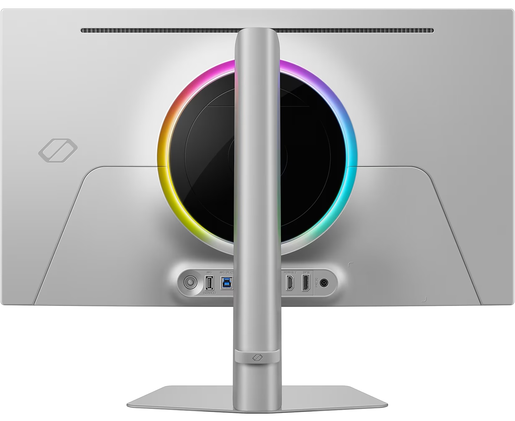 A 0.03ms grey to grey response time is specified, with OLED technology known for exceptional pixel responsiveness. The stand is fully adjustable, including height (120mm or 4.72 inches) adjustment and pivot into portrait. A customisable ‘Core Sync’ RGB LED lighting element surrounds the attachment point. The stand can be removed using a quick-release mechanism and replaced by an alternative 100 x 100mm VESA compatible solution. The ports face backwards beneath the stand attachment point and include; 2 USB 3.2 Gen1 ports (plus Type-B upstream), a 3.5mm headphone jack, 2 HDMI 2.1 ports, DP 1.4 (with DSC) and a DC power input (external ‘power brick’).